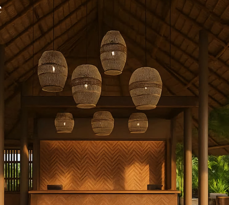 Carefully made using natural fibers and traditional weaving techniques, the lamp creates a soft ambient glow that enhances relaxation and comfort while adding a statement architectural element to the room. Its textured woven shade allows light to filter gently through the patterns, producing beautiful shadows and a cozy atmosphere — perfect for hotel receptions, lodges, restaurants, living rooms, or luxury outdoor spaces. The earthy tones and timeless design blend effortlessly with modern, rustic, bohemian, and safari-style interiors.